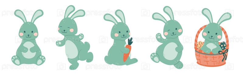Набор симпатичных кроликов в плоском стиле, изолированных на белом фоне