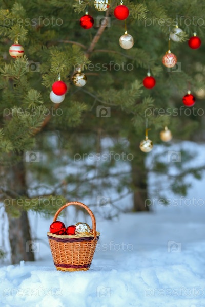 Красные и желтые елочные шары в плетеной корзине стоят на снегу. Рождественская или новогодняя композиция