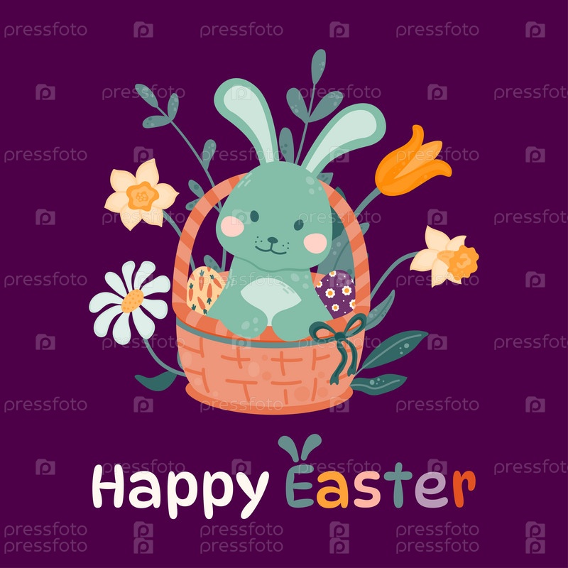 Пасхальный кролик сидит в плетеной корзине с разноцветными пасхальными яйцами на фоне цветов