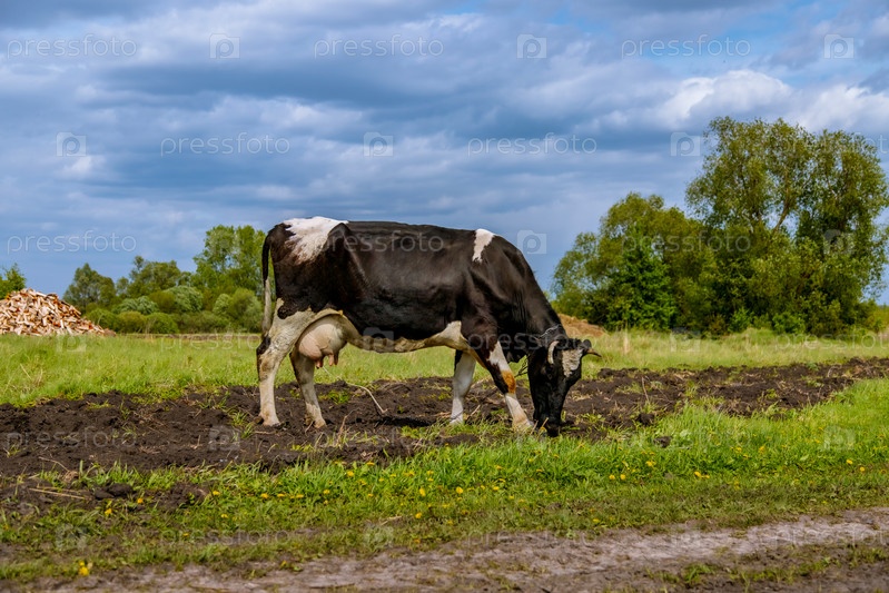 Молочная корова с выменем стоит на пастбище под голубым небом на зеленой траве, глядя на далекий горизонт. Животноводство. Сельскохозяйственная промышленность