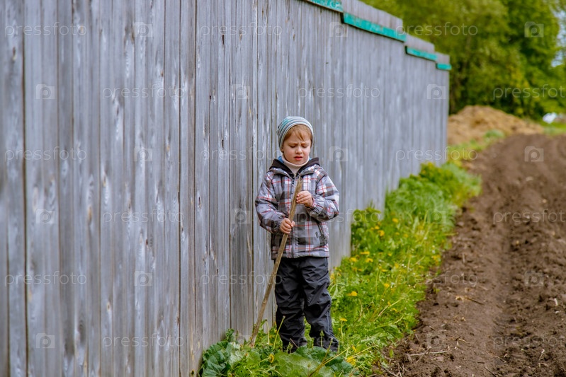 Ребенок в деревне возле вспаханного вручную поля. Деревенский пейзаж. Земля подготовлена к посадке. Весенняя посадка картофеля