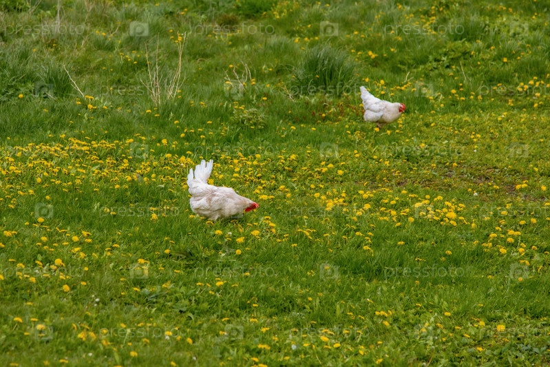 Куры и петухи в природе, свободный выгул, выращивание животных без гормонов. Сельскохозяйственная промышленность. Животноводство