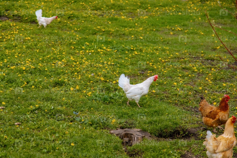 Куры и петухи в природе, свободный выгул, выращивание животных без гормонов. Сельскохозяйственная промышленность. Животноводство