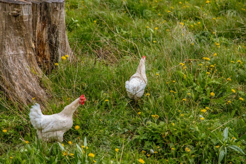 Куры и петухи в природе, свободный выгул, выращивание животных без гормонов. Сельскохозяйственная промышленность. Животноводство