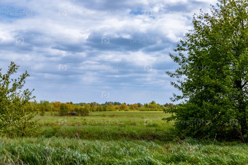 Сельские места на фоне облачного неба. Деревенский пейзаж. Весенняя сочная зелень листвы. Голубое небо