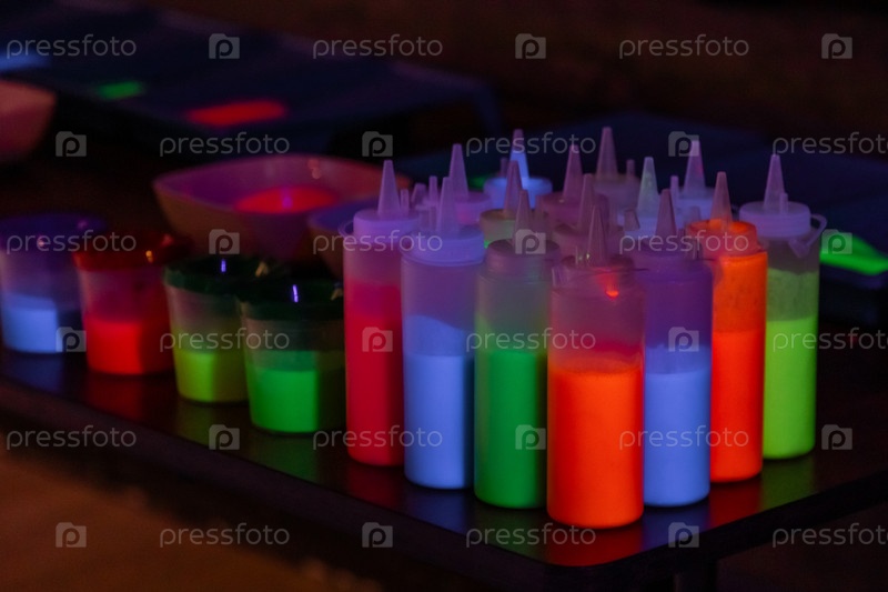 Бутылочки наполнены разноцветными флуоресцентными красками для раскрашивания картинок. Яркие детские цвета