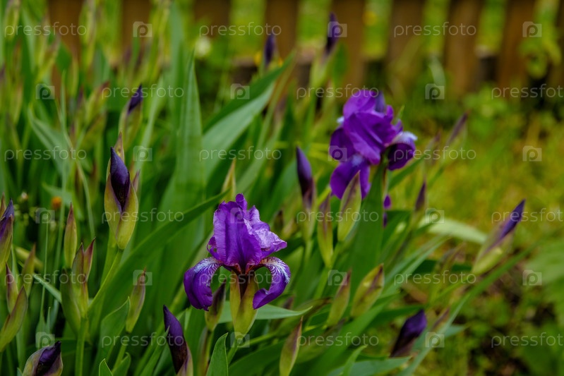 Красивые цветы ириса в саду у забора дома. Фиолетовый цветок