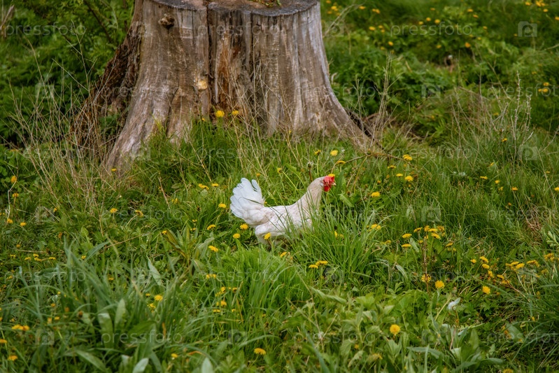 Куры и петухи в природе, свободный выгул, выращивание животных без гормонов. Сельскохозяйственная промышленность. Животноводство