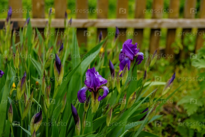 Красивые цветы ириса в саду у забора дома. Фиолетовый цветок