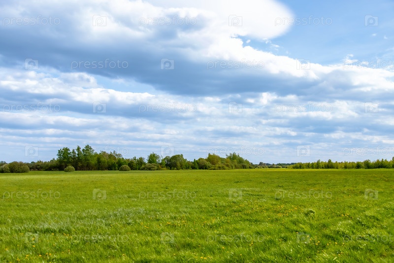 Сельские места на фоне облачного неба. Деревенский пейзаж. Весенняя сочная зелень листвы. Голубое небо