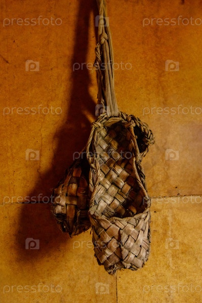 На деревянной стене висят плетеные и очень старые лапти. старая деревенская жизнь