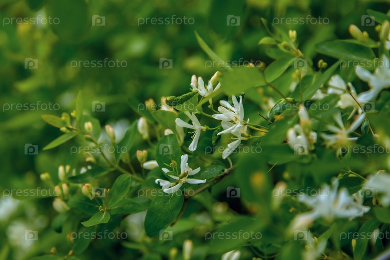 Маленькие белые цветы на фоне зеленых листьев. цветочный фон. Красивое садовое растение