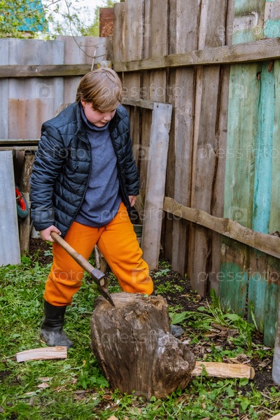 Портрет мальчика на природе. Помощник в деревне. Рубит дрова и стучит по чему-то молотком