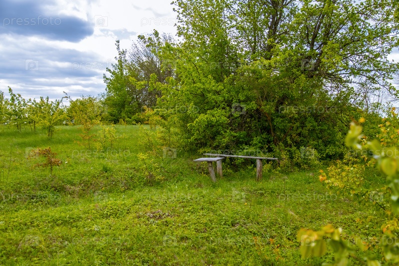 Медитационная скамейка на холме. Сельские места на фоне облачного неба. Деревенский пейзаж. Весенняя сочная зелень листвы. Голубое небо
