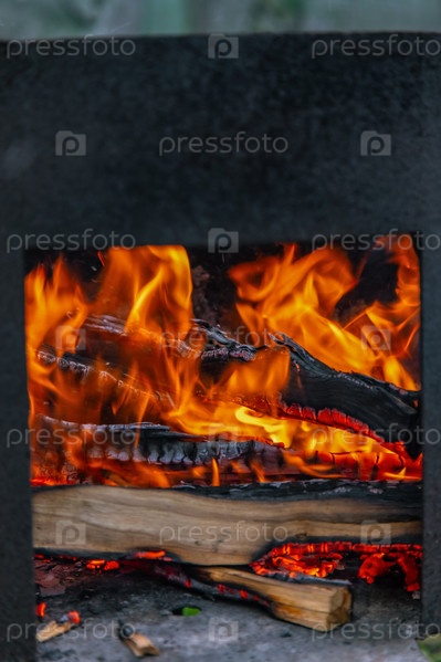 Огонь. приготовление пищи на открытом огне. сжигание дров в камине, концепция отопления дома, создание уютной атмосферы в доме