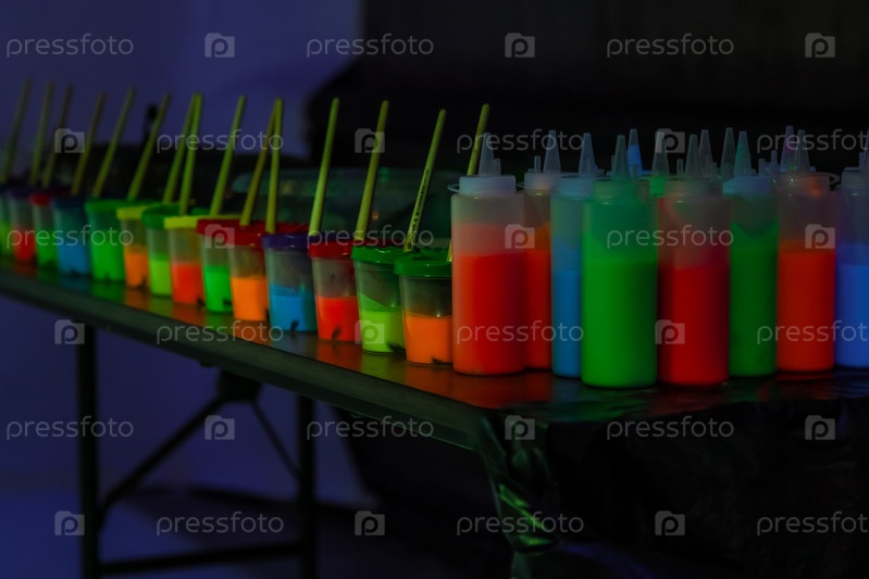 Бутылочки наполнены разноцветными флуоресцентными красками для раскрашивания картинок. Яркие детские цвета