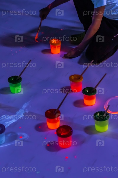 Бутылочки наполнены разноцветными флуоресцентными красками для раскрашивания картинок. Яркие детские цвета