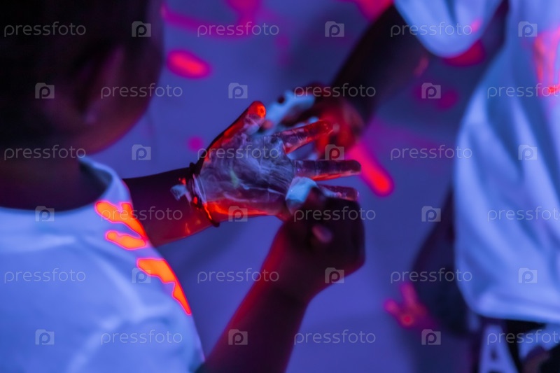 Дети рисуют ладошками разноцветными флуоресцентными красками на полу и стенах. яркие цвета для детей. много ярких цветов