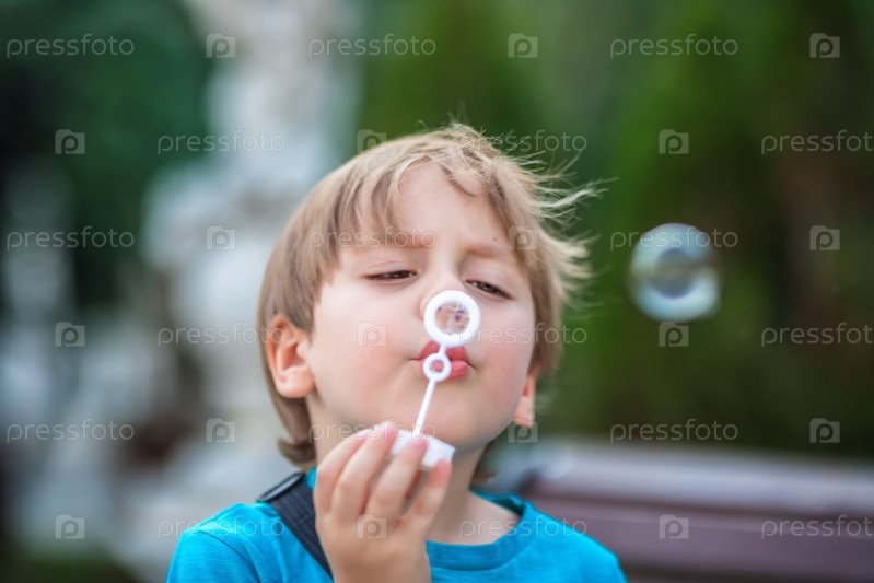 Счастливый мальчик пускает мыльные пузыри в парке солнечным летним днем