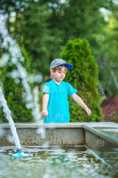 Маленький мальчик играет у фонтана в солнечный летний день. Активный летний досуг для детей в городе