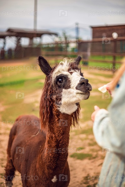 Портрет альпаки крупным планом. Альпака в загоне