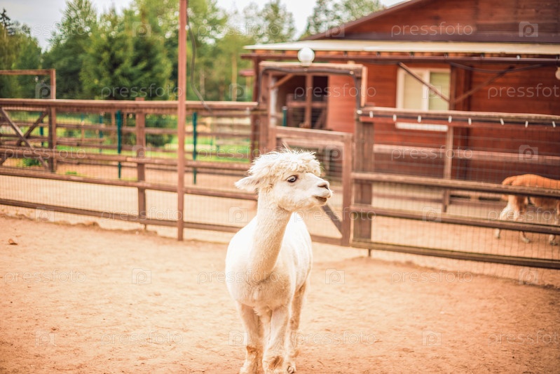 Портрет альпаки крупным планом. Альпака в загоне