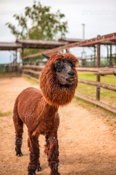 Портрет альпаки крупным планом. Альпака в загоне