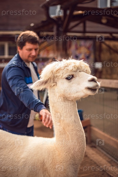 Мужчина кормит альпаку на ферме. Альпака в загоне