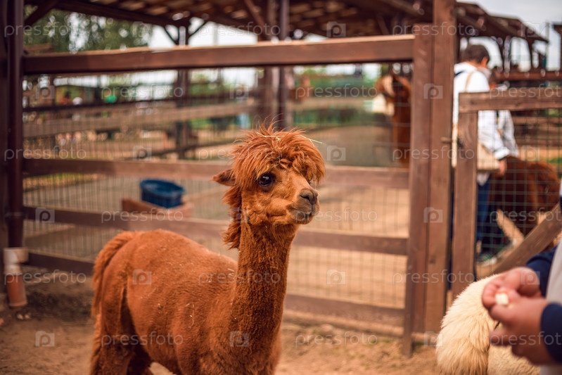 Мужчина кормит альпаку на ферме. Альпака в загоне
