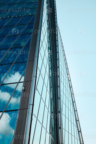 Современный небоскреб отражает прекрасное голубое небо и пушистые белые облака