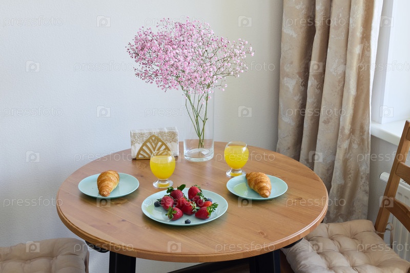 Красиво накрытый яркий стол для завтрака с вкуснейшими круассанами и свежей клубникой