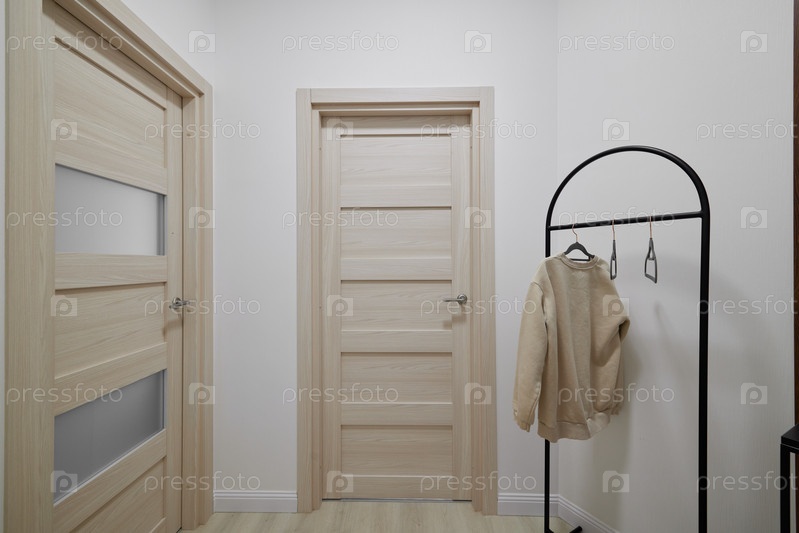 Современная минималистская прихожая со стильными деревянными дверями и универсальной вешалкой