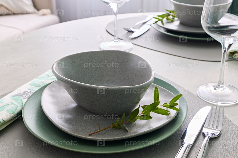 Элегантная сервировка стола с модной посудой, красивой зеленью и искусными штрихами