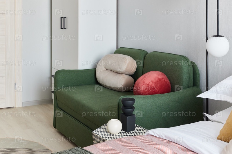 Стильный и современный зеленый диван в современной и шикарной спальне