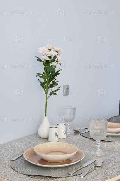 Элегантная сервировка стола с красивыми цветами и стильной посудой для гостей