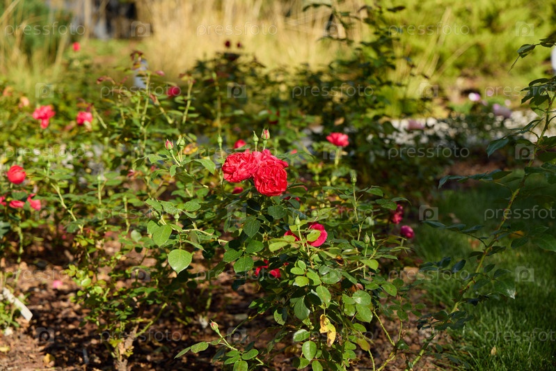 Прекрасная композиция из ярких розовых роз в живописном саду, цветущая