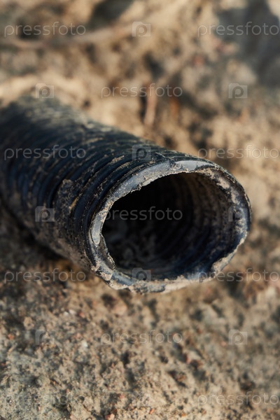 Крупным планом вид старой и выветренной трубы, лежащей на песчаном грунте, на фоне окрестностей