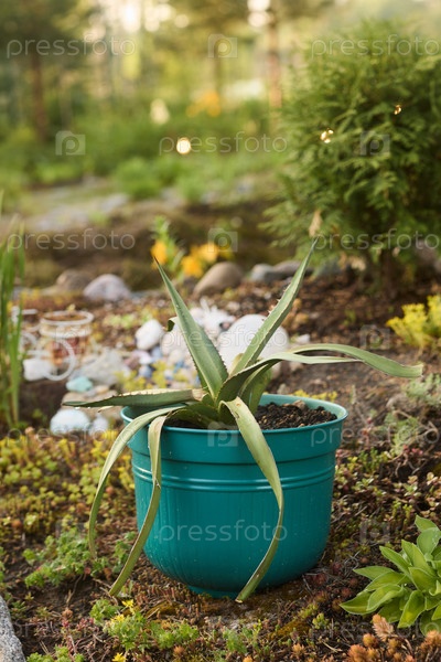 Красивое и яркое растение алоэ вера, высаженное в бирюзовый горшок, в пышном саду