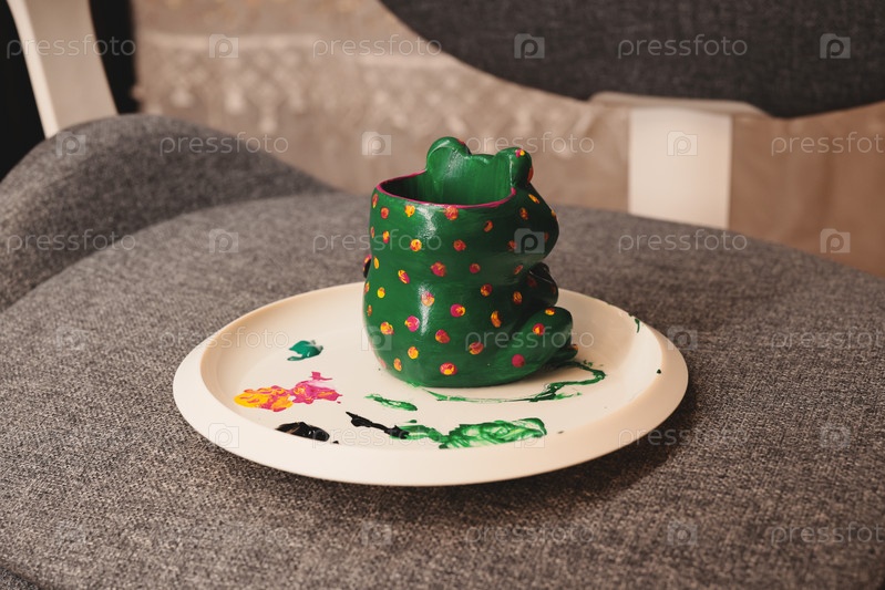 Красочная кружка в виде лягушки ручной работы из керамики на красивой тарелке для уникального наслаждения