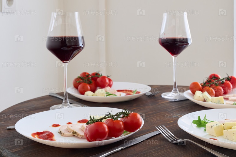 Элегантная сервировка обеденного стола с вином, разноцветными помидорами и изысканной посудой