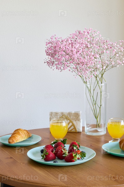 Красиво сервированный стол для завтрака со свежей клубникой и слоеным круассаном