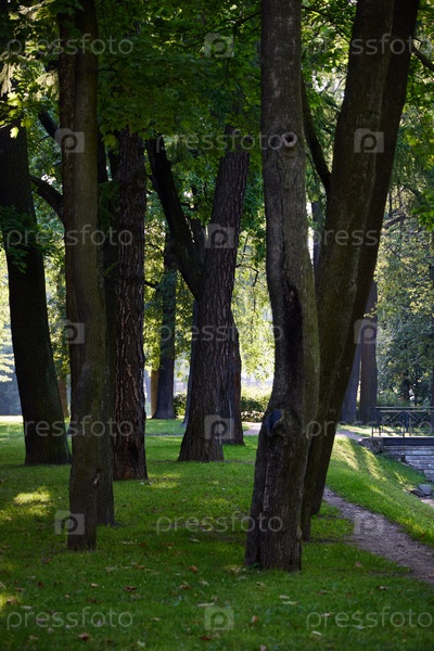 Спокойный парк с пышными зелеными деревьями вдоль красивой дорожки для прогулок