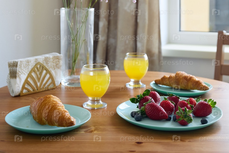 Вкусно приготовленный завтрак, полный теплых круассанов и свежих ягод