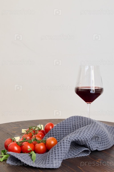 Красиво расставленный бокал красного вина со свежими помидорами черри на темном деревянном столе