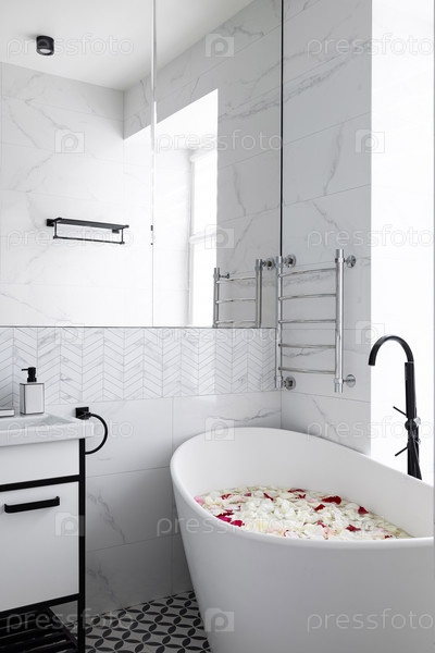 Элегантная современная ванная комната с успокаивающей ванной, украшенной красивыми лепестками