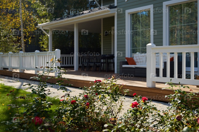 Очаровательное крыльцо красивого дома, окруженное яркими розами