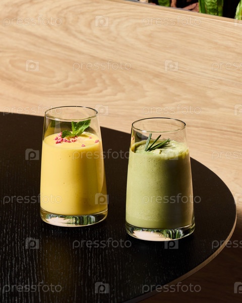 Яркие смузи, красиво разложенные на деревенском деревянном столе для потрясающей демонстрации