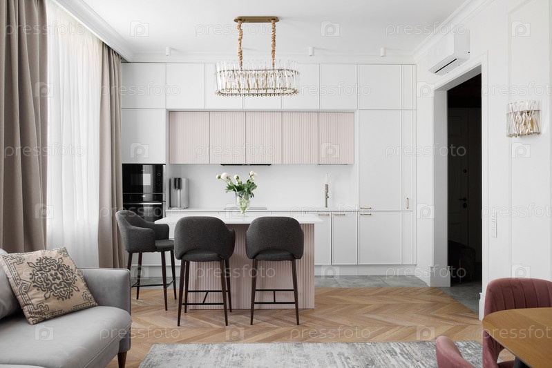 Современный дизайн кухни с островом и элегантными вариантами внешнего освещения