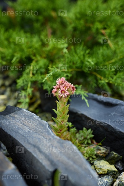 Нежный розовый цветок, изящно расположенный среди натуральных камней в живописном ландшафте