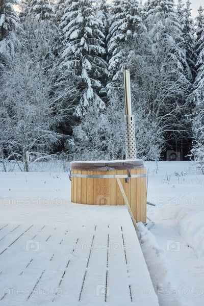 Ощутите красоту уютной деревянной джакузи, расположенной на фоне очаровательного зимнего пейзажа